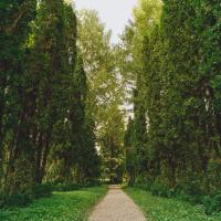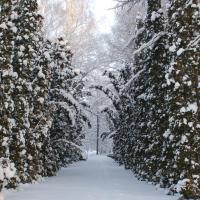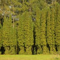 Мы подошли к аллее туи западной, представленной колоновидной формой, на фоне которой стоит сфотографироваться. Эта форма туи была найдена в природе и получила широкое распространение в культуре; в настоящее время она наиболее популярна из всех форм. Перед нами очень декоративное растение, которое не нужно стричь.