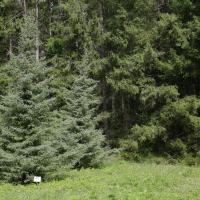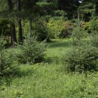 Слева от секционного аншлага Вы видите группу молодых вечнозелёных хвойных – это лжетсуга Мензиса. Этот вид – один из гигантов в мире растений. На своей родине – на западе США – лжетсуга Мензиса образует горные леса, где отдельные деревья достигают 100 м высоты. По ископаемой пыльце известно, что до эпохи оледенений какие-то виды лжетсуг произрастали на территории Татарстана.