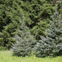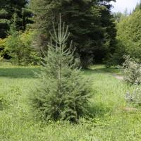 Справа мы видим североамериканские виды елей: ель сизую, или канадскую, и чуть дальше – ель чёрную, широко распространённых в северо-восточных штатах США и по всей Канаде. Если в Европе и Сибири известно 3 вида елей, то тайгу Северной Америки слагает 6 видов. Флора хвойных Северной Америки побогаче нашей.