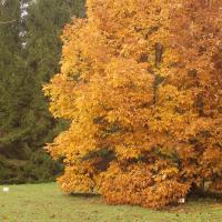 Справа представитель семейства ореховых – кария белая. От прочих орехов, помимо листьев, кария отличается плодами: если у первых плоды раскрываются на две половинки (вспомним грецкий орех), то у карии – на четыре части. Кария белая произрастает на востоке США. Это не только ценная орехоплодная порода, но и очень декоративное растение. Особенно дерево красиво осенью, когда её густая листва окрашивается в яркий золотисто-жёлтый цвет. В России это замечательная древесная порода встречается редко даже в коллекциях ботанических садов и дендрариев. На территории, которую сегодня занимает Республика Татарстан, кария и другие орехи во множестве произрастали до эпохи Великих оледенений, о чём свидетельствует ископаемая пыльца этих растений в плиоценовых отложениях региона.