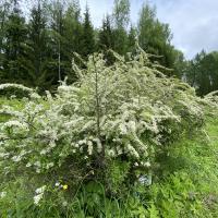 Большая часть экспозиции представлена разными видами спирей. Спиреи – небольшие листопадные кустарники по большей части открытых, часто довольно сухих местообитаний. Их мелкие цветки собраны в многочисленные щитковидные, реже колосовидные соцветия белого или розового цвета. Данные виды – неприхотливые растения и широко используются в озеленении городов и поселков.